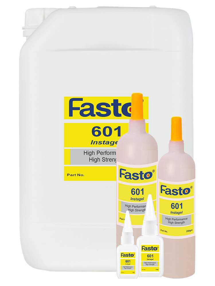 Fasto 601 is a High Viscosity, High Strength, Medium Slow Curing, Specially Formulated Modified Ethyl Cyanoacrylate Adhesive Gel. Fasto 601 is suitable for bonding substrate like rubber, plastics, metals, etc. Fasto 601 offers fast & reliable curing for substrates like rubber & plastics. Due to medium to slow curing, enough time is available for surface alignment.