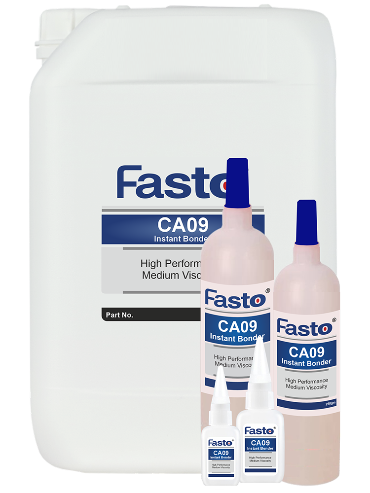 Fasto CA09 is a Low Viscosity, High Strength, Very Fast Curing, Specially Formulated Modified Ethyl Cyanoacrylate Adhesive. Fasto CA09 is suitable for bonding difficult to bond substrates like leather etc. Fasto CA09 offers Very High-Speed curing for substrates like rubber & plastics.