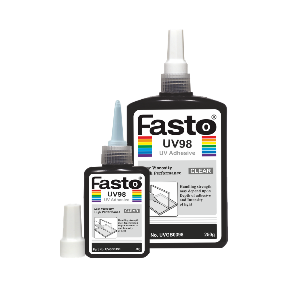 Fasto UV98 is a single-component, very low viscosity, UV-curable adhesive designed to deliver clear, flexible, and aesthetically clean bonds when exposed to UV light. It is specially formulated to provide medium-strength bonding to glass, making it ideal for decorative and precision glass applications where transparency and non-yellowing performance are critical.
